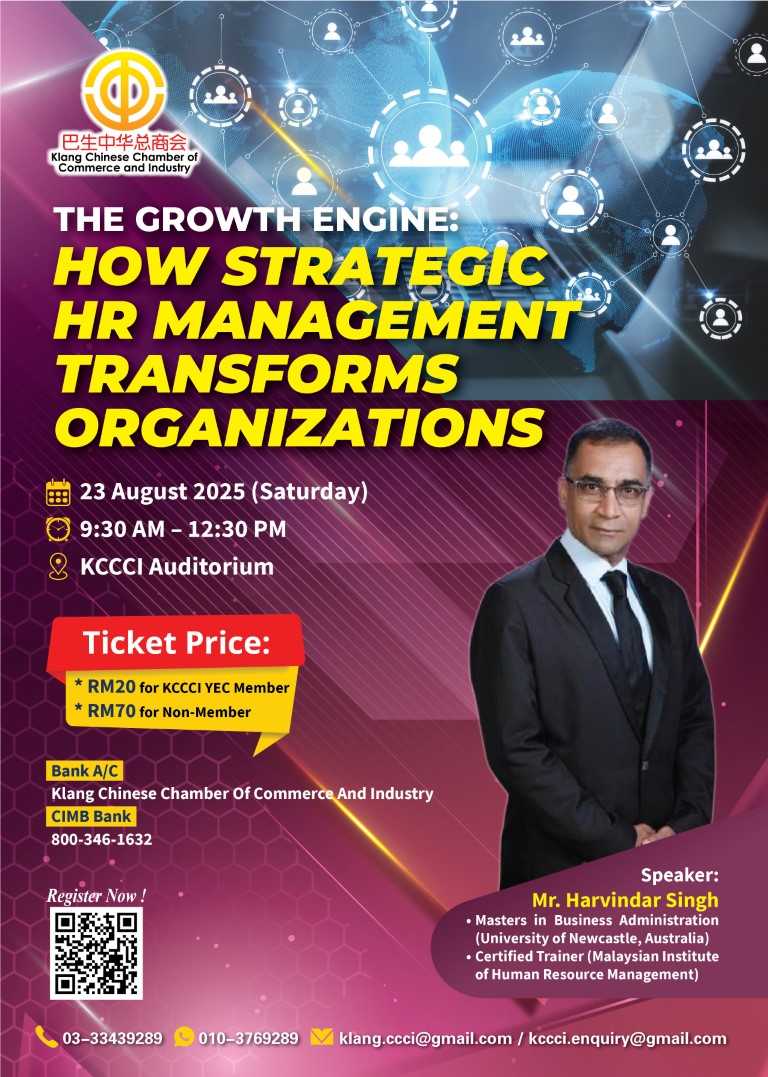 Join us for an insightful session on The Growth Engine: How Strategic HR Management Transforms Organizations with renowned speaker, Mr. Harvindar Singh — MBA graduate from the University of Newcastle, Australia, and a certified trainer with the Malaysian Institute of Human Resource Management.