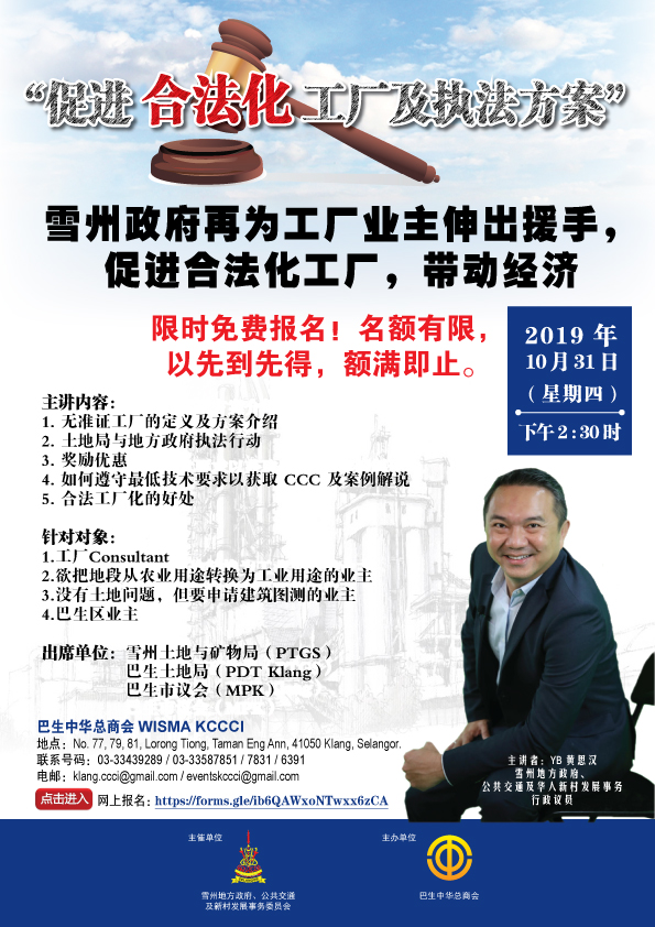 为了促进合法化工厂,带动经济,雪州政府再为工厂业主伸出援手!为此本会将举办“促进合法化工厂及执法方案”讲解会,让专家为您剖析工厂漂白计划的程序与详情。