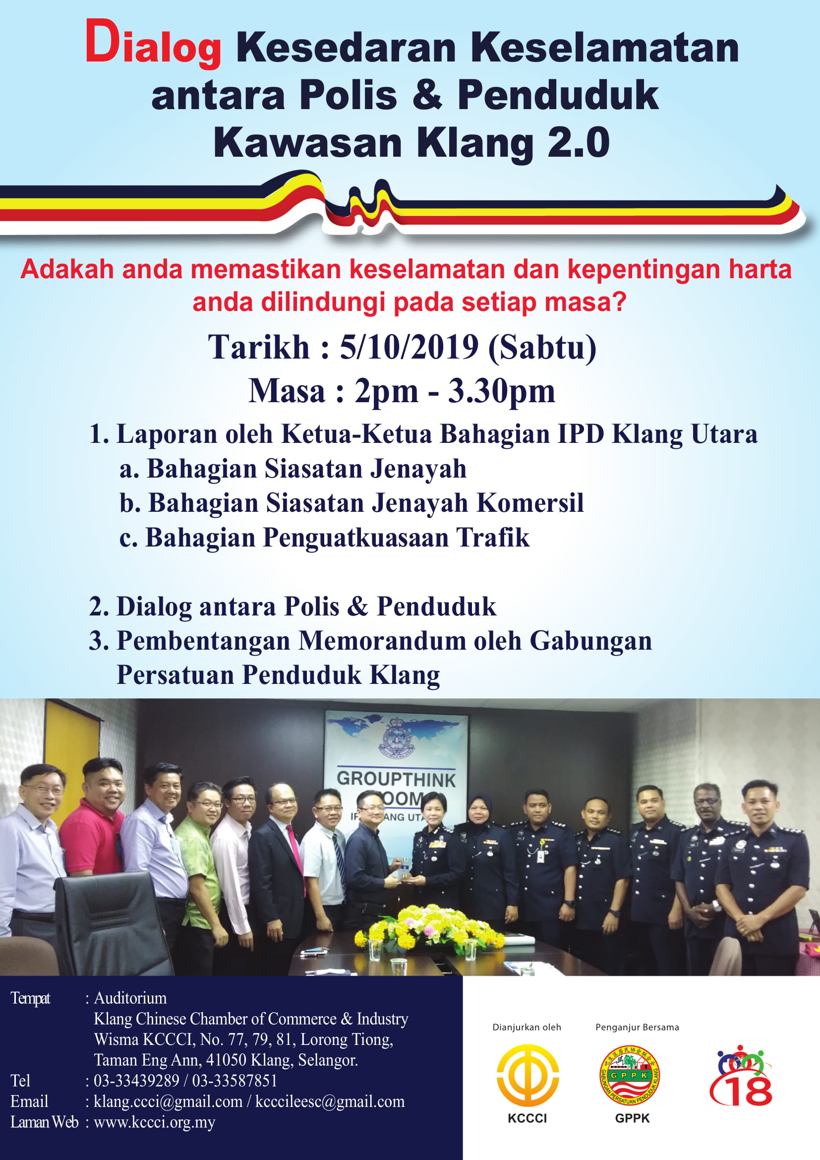 主办单位在此诚邀民众踊跃出席此交流会,一同改善治安!现场巴生北区警局的三个单位:罪案调查科、商业罪案调查科和交通将会进行分享,也设有问答环节解答民众的问题。