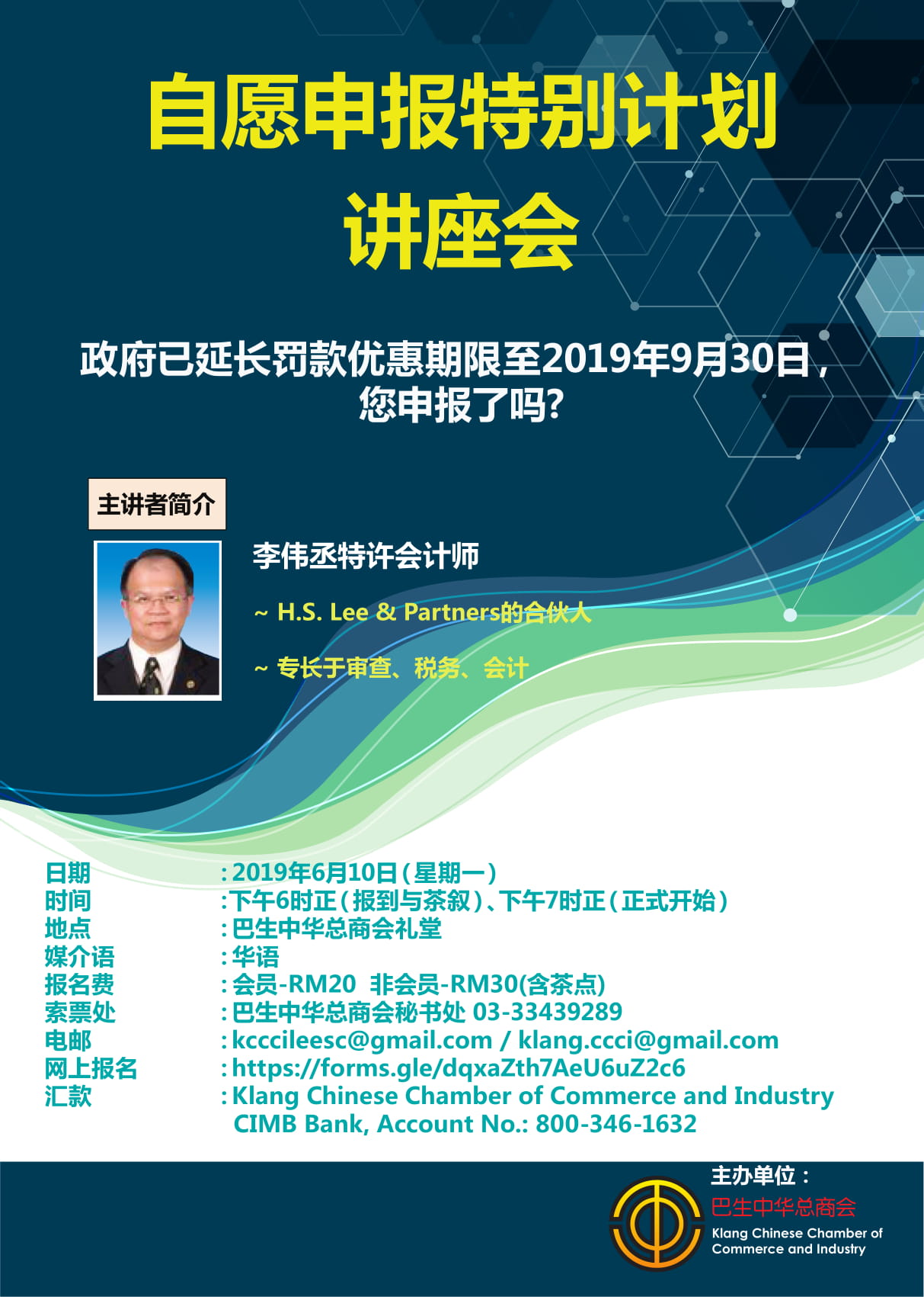 汇款:KLANG CHINESE CHAMBER OF COMMERCE AND INDUSTRY(CIMB 800-346-1632)