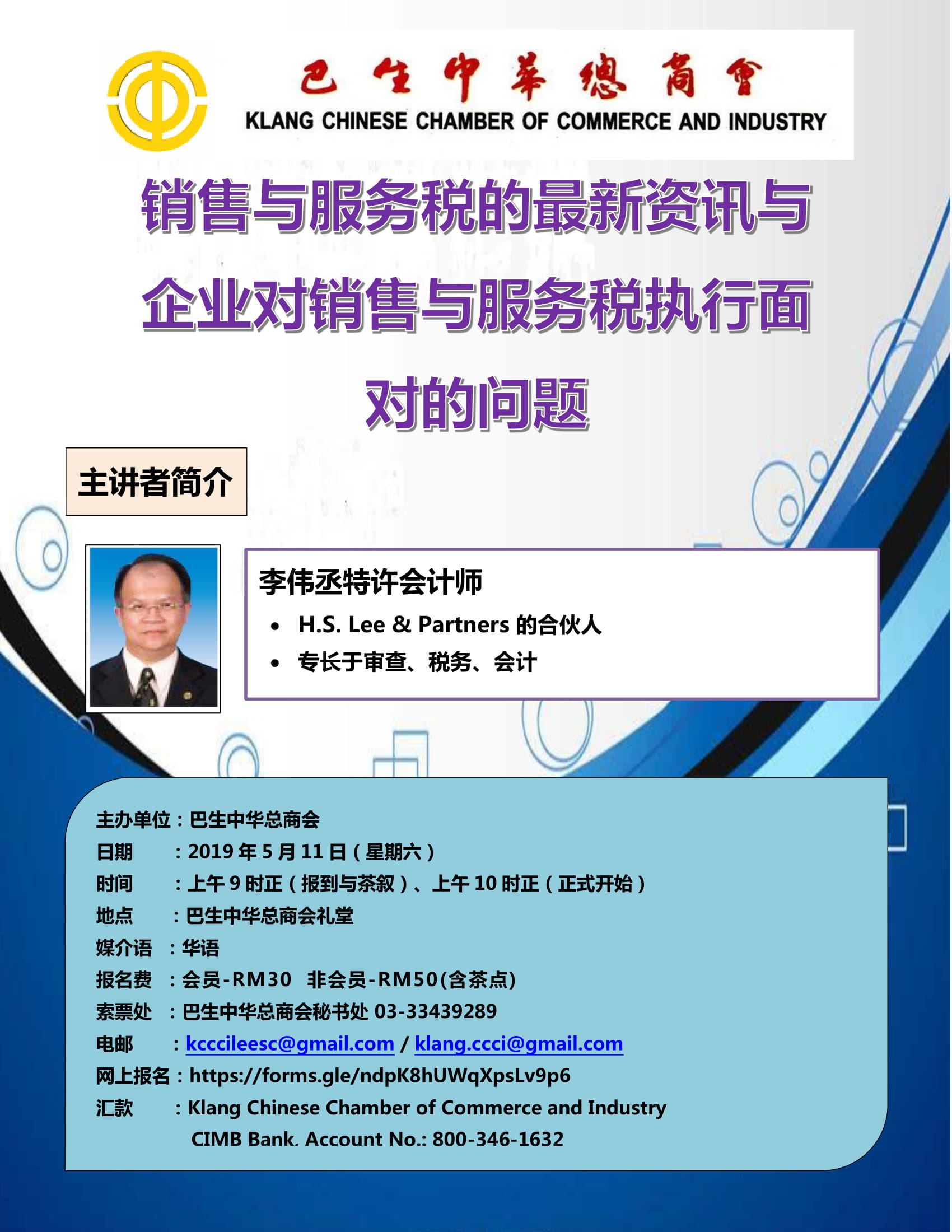 若您想更加了解销售与服务税的最新资讯,也正寻求协助的话,欢迎出席由巴生中华总商会举办的销售与服务税的最新资讯与企业对销售与服务税执行面对的问题讲座会,详情如下: