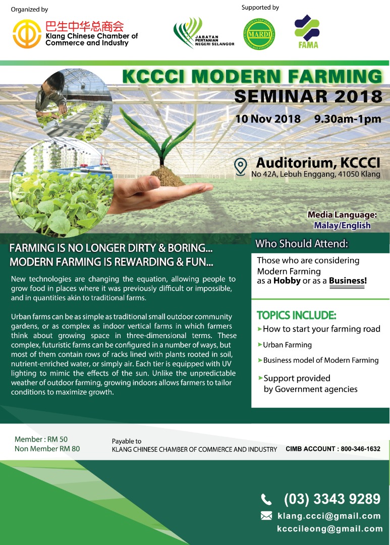 The Klang Chinese Chamber of Commerce and Industry's Agriculture and Industry Sub Committee will organise KCCCI Modern Farming Seminar 2018 on 10th November 2018 at the KCCCI's Auditorium.
