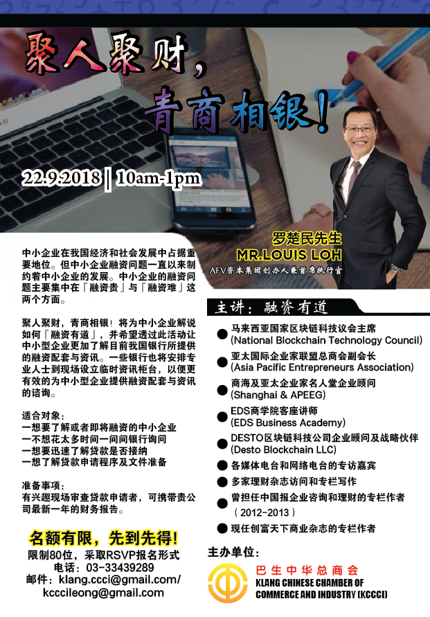 AFV资本集团创办人兼首席执行官罗楚民先生将担任此活动主讲嘉宾,他将为中小企业解说如何「融资有道」。除此之外,希望透过此活动能够让中小型企业更加了解目前我国银行所提供的融资配套与资讯。一些 银行也将安排专业人士到现场设立临时资讯柜台 ,以便更有效的为中小型企业提供融资配套与资讯的谘询。