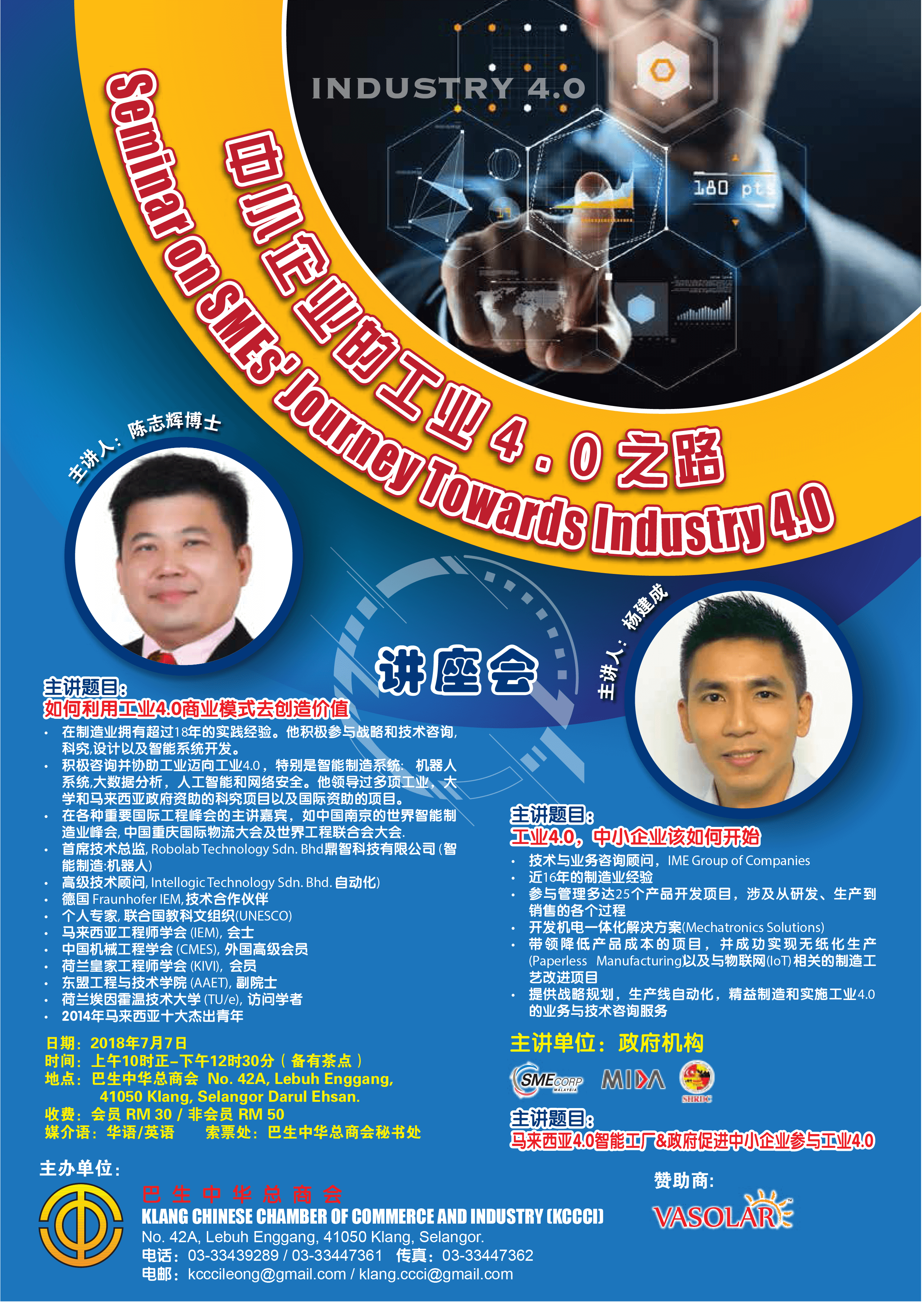 巴生中华总商会将于以下日期、时间、地点举办 "中小企业的工业4.0之路"讲座会。