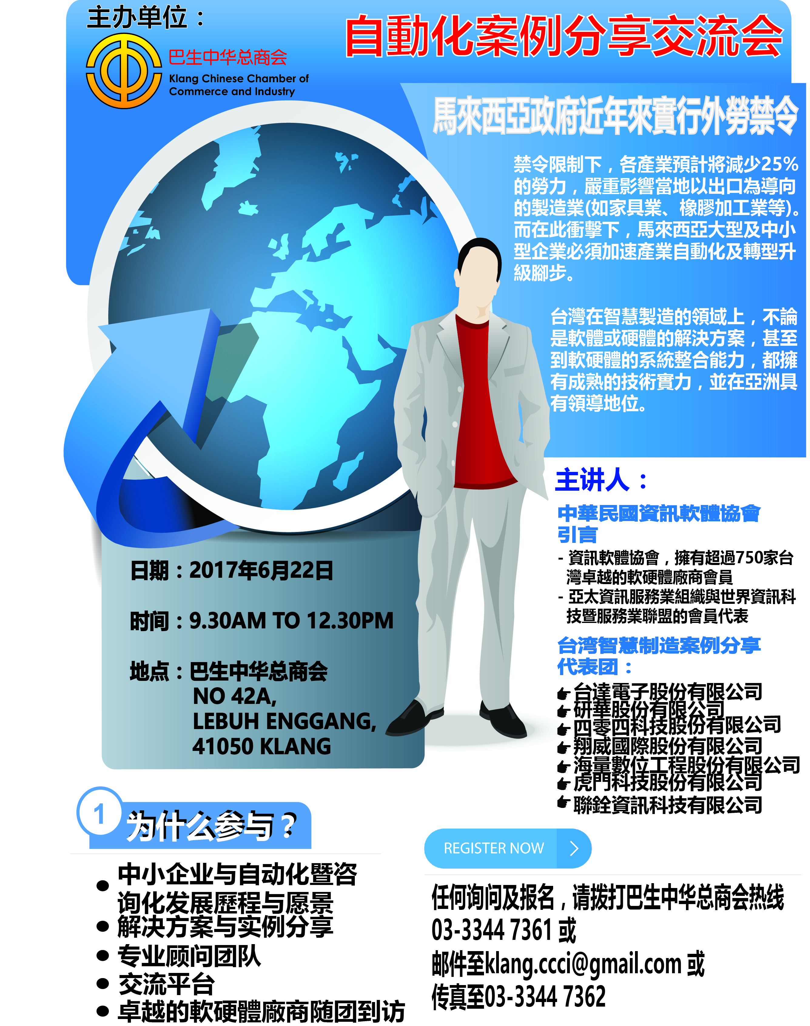本会将于2017年6月22日上午9时30分,于巴生中华总商会礼堂举办“自动化案列分享交流会”(Automation & Informatization Development of Taiwan SME - Case Studies and Sharing Session)。此自动化案列分享交流会将由7家台湾智慧制造组成的代表团分享他们的经验给大家。