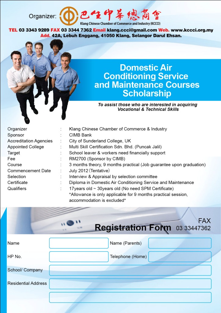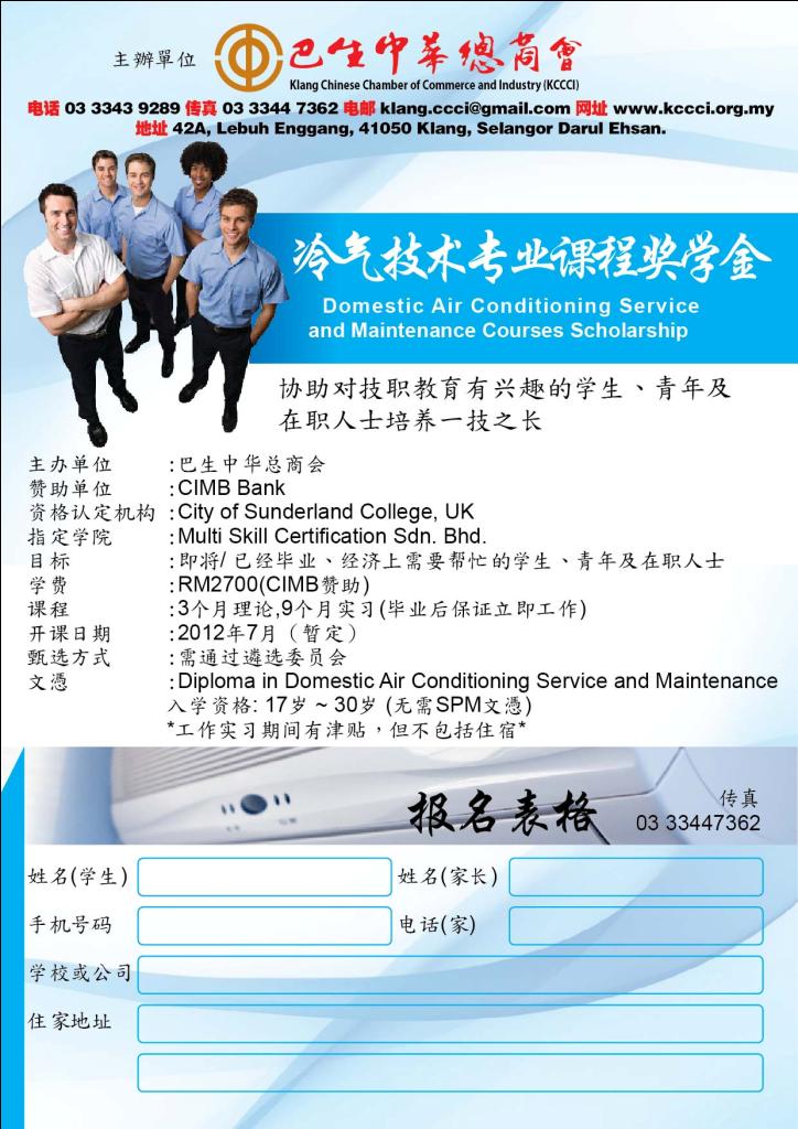 巴生中华总商会连同联昌银行回馈社会基金以及Multi Skill Certification Sdn.Bhd. 所举办的“冷气技术专业课程奖学金”目的是为协助经济上需要帮忙的学生、青年及在职人士参与技职教育,培养一技之长。此文凭资格认定机构是South Essex College, UK。
